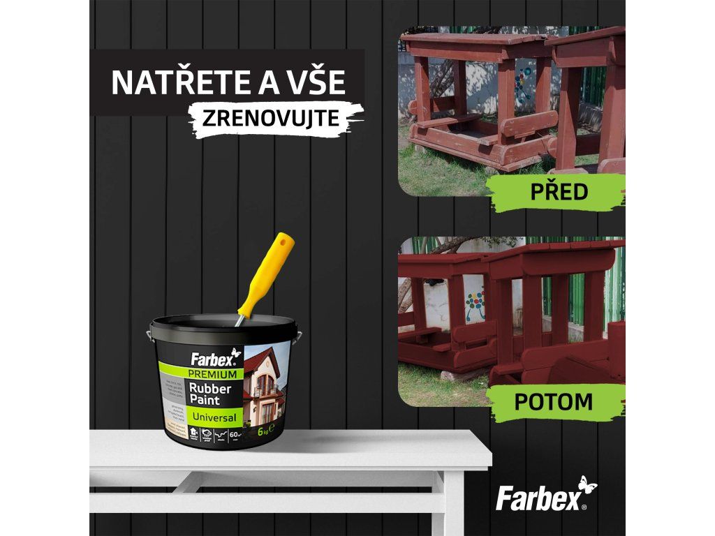Gumová barva Farbex je vhodná pro nátěry střech, fasád budov, soklů, kovových okapů a okapů, cihelného a kamenného zdiva, sloupů, plotů, obytných a zdravotnických prostor, chodeb, stěn koupelen, kuchyní, restaurací, herních a sportovních areálů, obchodních hal atd.